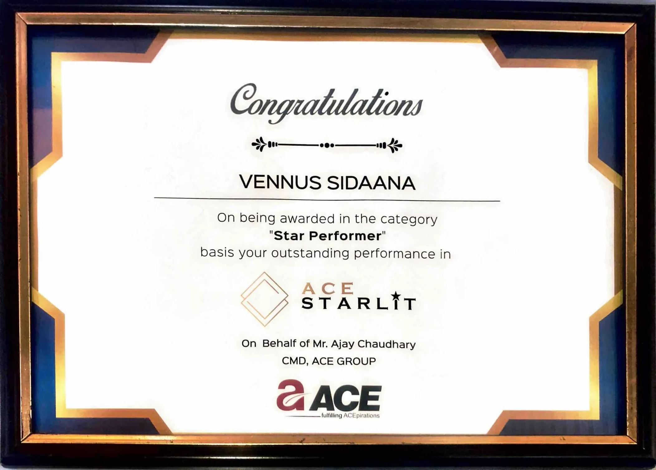 Vennus Sidaana was honored as a Star Performer by Ace Group