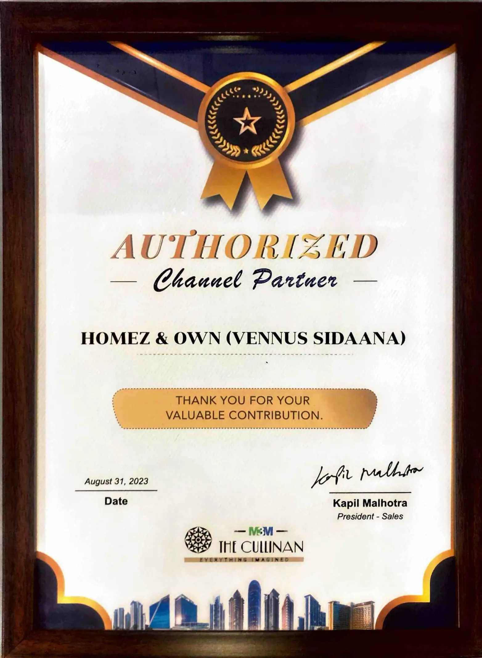 Homez & Own was awarded for valuable sales contributions.